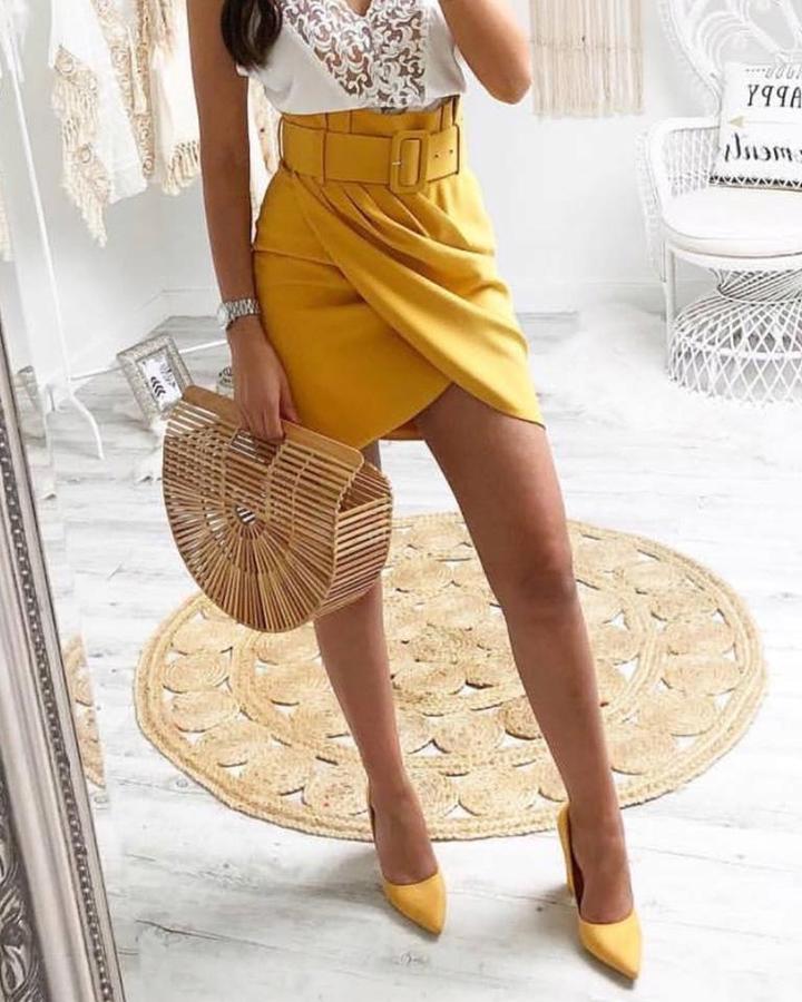 Jakie dodatki warto dobrać do musztardowej spódnicy?